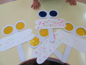 羽根の部分に指スタンプをポンポンポンと自由につけて、